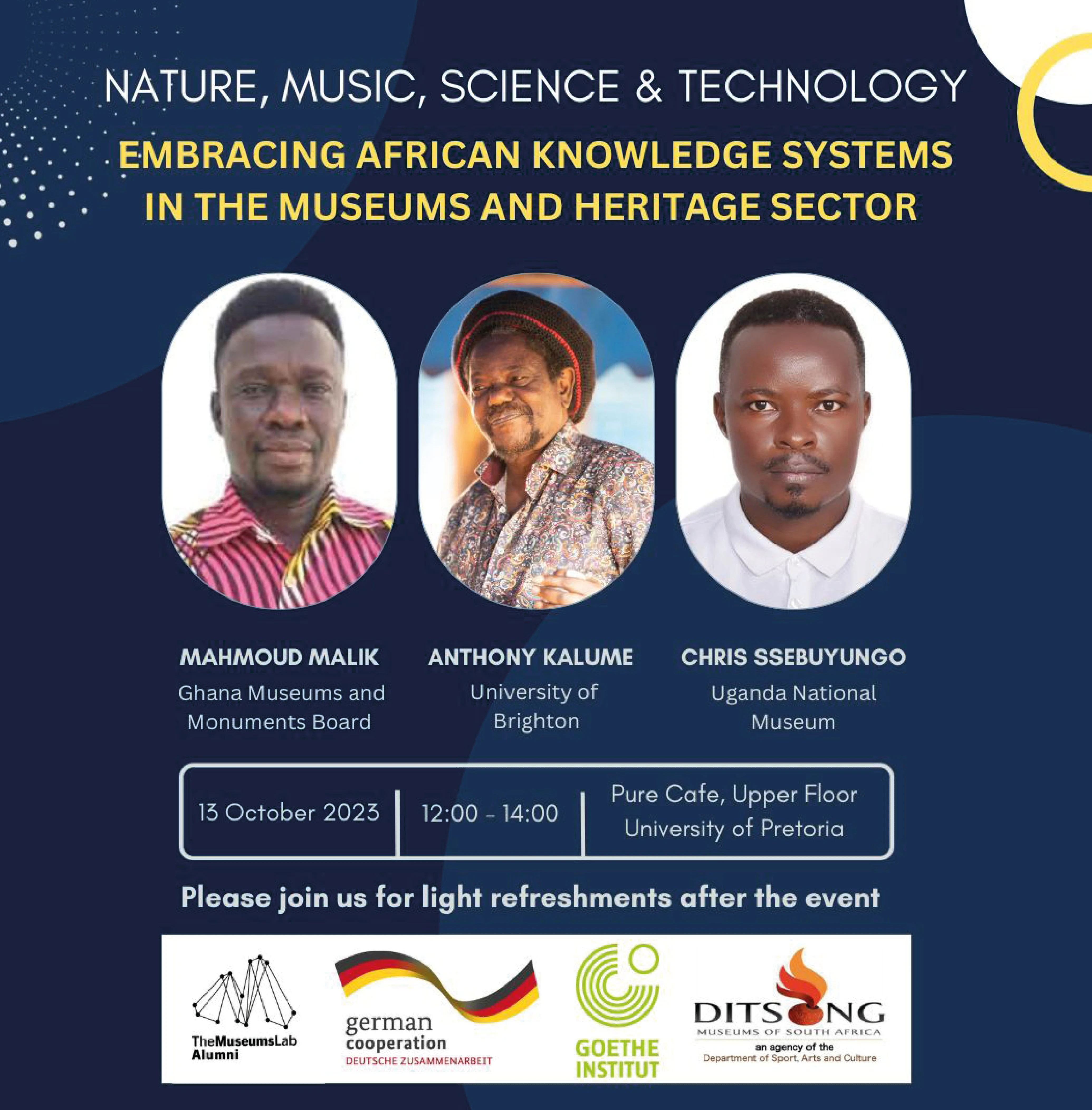 During this time, the alumni group also visited local heritage institutions and hosted a hybrid public symposium at the University of Pretoria, entitled 'Nature, Music, Science and Technology: Embracing African Knowledge Systems in the Museums and Heritage Sector.' Anthony, Malik and Christopher presented Kenyan, Ghanian and Ugandan perspectives on the theme. Around 30 students and colleagues from the University of South Africa, University of Pretoria and Ditsong Museums of South Africa (DMSA), attended the event. Amongst the attendees was a group of DMSA interns, who were completing degrees in Indigenous Knowledge Systems from the University of Venda. The hybrid event was well attended by students and staff from academic and museum institutions in Pretoria.